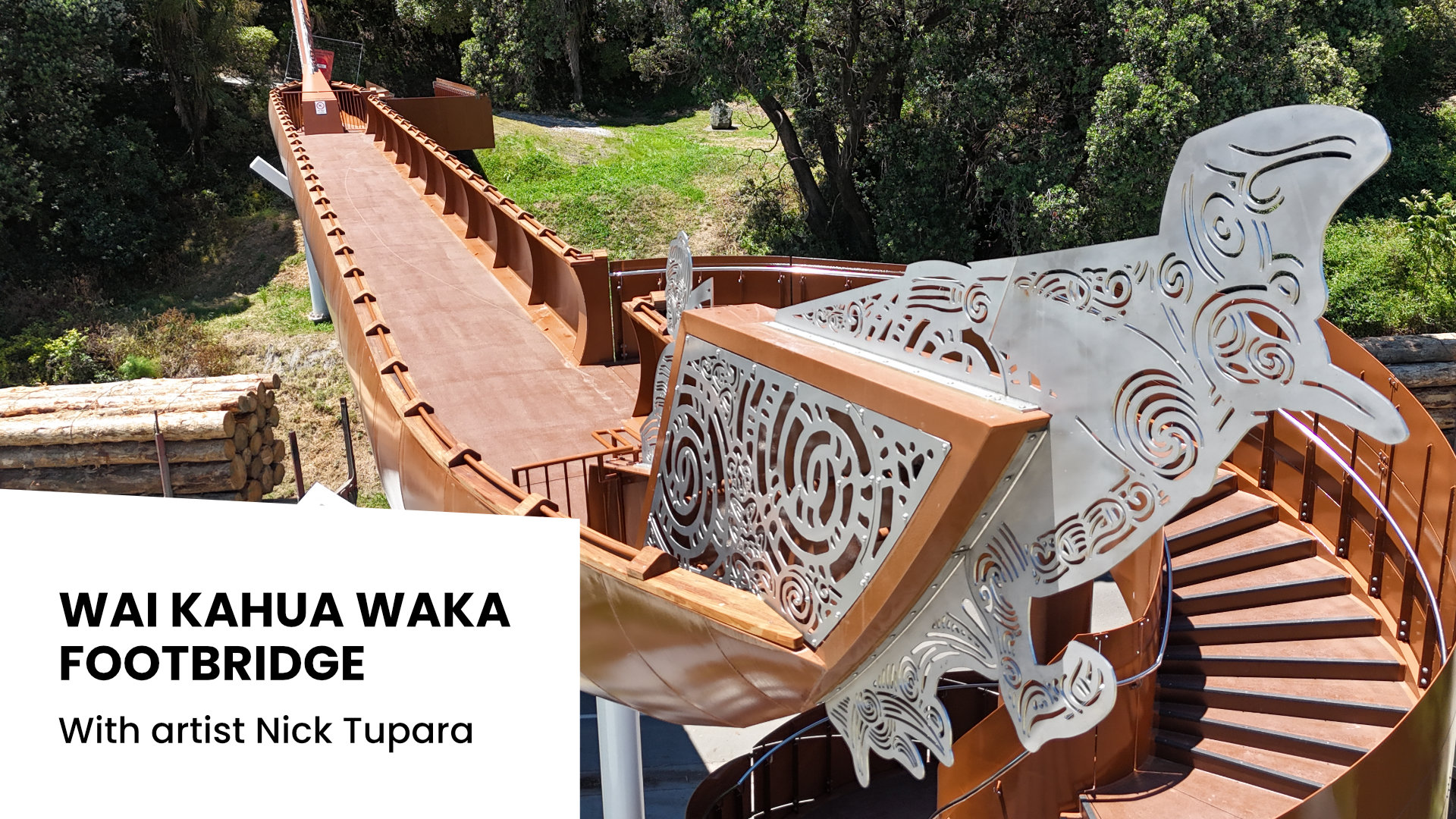 Wai Kahua Waka Footbridge is one of our most recent bridges. The entire superstructure is shaped into a waka (canoe), and features prow and stern panels designed by Gisborne/Turanganui-a-Kiwa Māori artist Nick Tupara.
