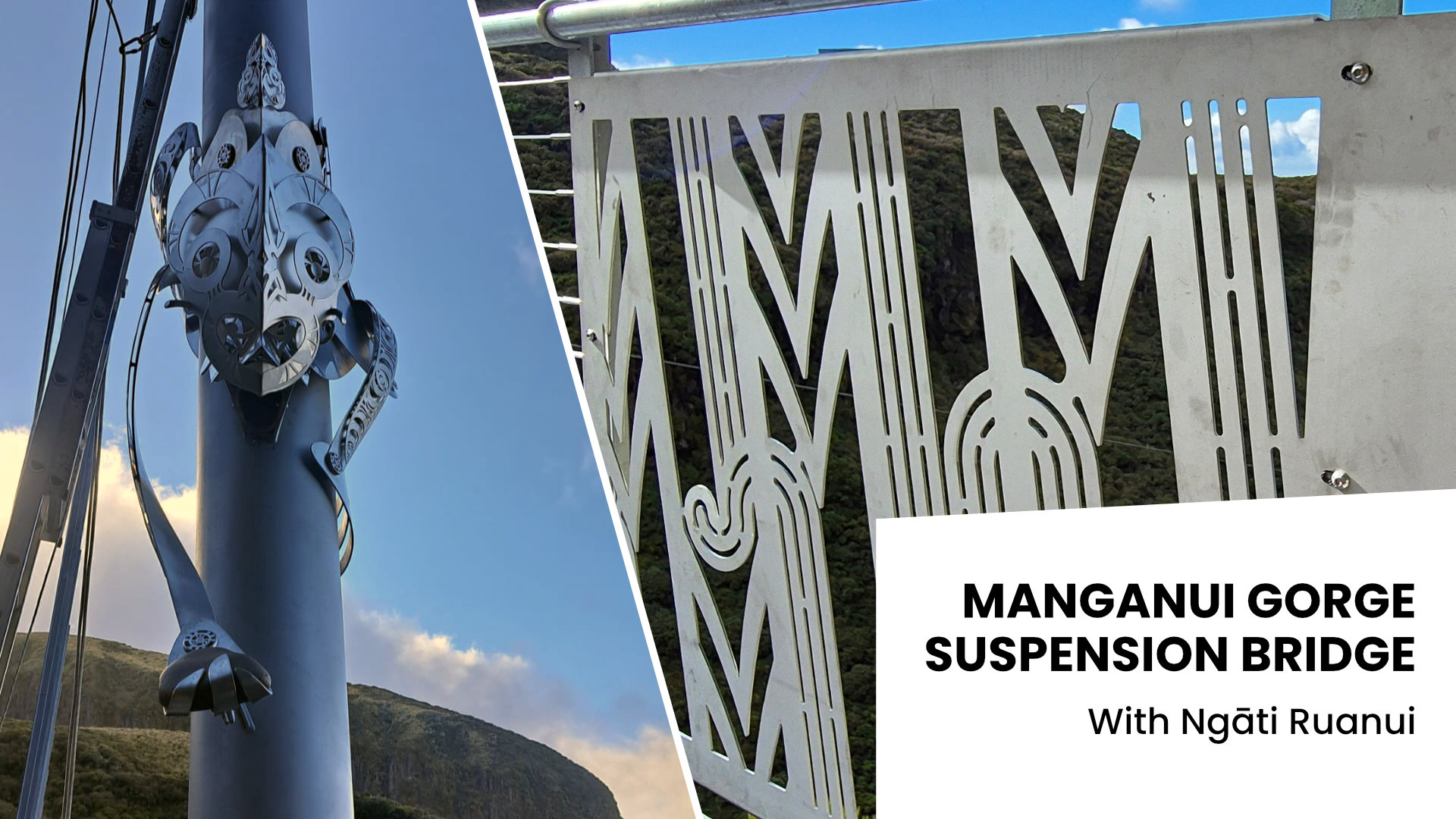 Manganui Gorge Suspension Bridge is a massive 100-metre-long footbridge on Mount Taranaki. During the design process we collaborated with Ngāti Ruanui artists to capture the mana (prestige & authority) representative of this iconic location. The mast and the balustrade panels feature distinctive and unique mauri-inspired artworks showcasing the various stages of the avalanche process. One mast also features a taonga gifted by Ngāti Ruanui to invite people onto the bridge.