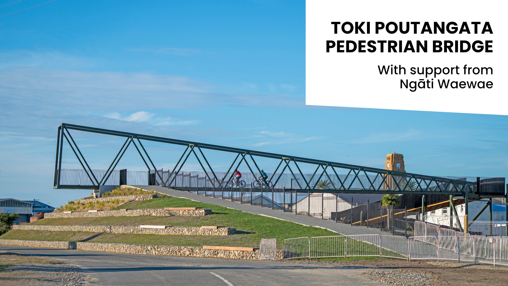 Toki Poutangata Pedestrian Bridge is a distinct cycle and pedestrian bridge in Westport. A toki poutangata is a ceremonial adze of chiefly authority – a pounamu blade lashed to an elaborately carved handle. This styling has been carried through into the truss design of the bridge structure, with its distinctive tapered shape and green colour, drawing focus to the Buller River. The concept has support from local iwi Ngāti Waewae. It represents strength, mana, bravery and triumph.